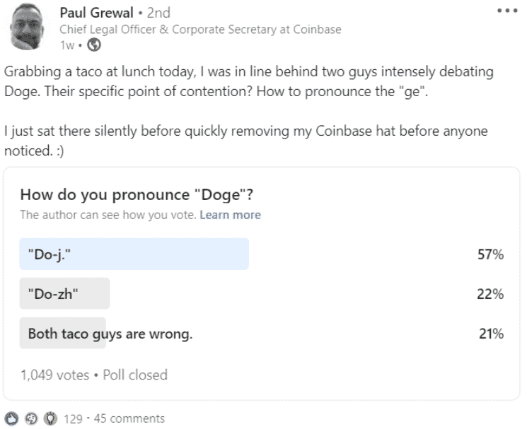 Kashkari v skutočnosti reagoval na anketu, ktorá sa objavila na portáli LinkedIn v profile Paula Grewala, ktorý pôsobí ako právny zástupca a firemný tajomník burzy Coinbase. Ten sa pýtal ľudí na správny spôsob vyslovovania „Doge”.