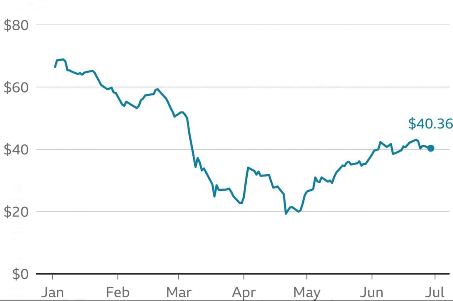 Na grafe vidíme dopad na cenu ropy v dolároch v roku 2020.