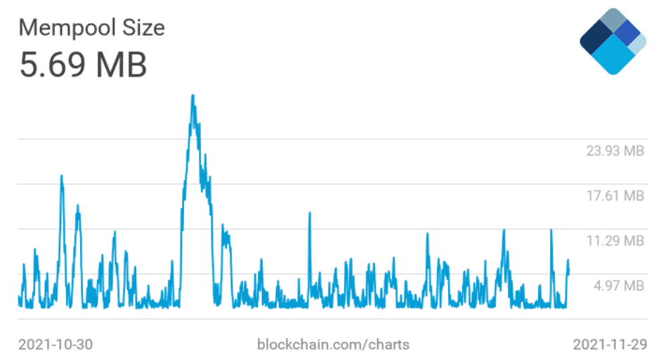 Ďalším možným dôvodom klesajúcich transakčných nákladov je odľahčenie mempoolu. Ten predstavuje zhromažďovanie všetkých čakajúcich transakcií pred ich potvrdením. Keď sa transakcia odošle do BTC siete, zostane v mempoole, kým nedostane potvrdenie. Pretože každý blok BTC má veľkosť 1 MB, veľký mempool môže povzbudiť ťažiarov, aby uprednostňovali lukratívnejšie transakcie.