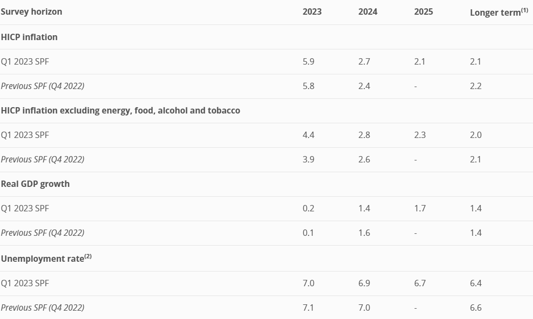 Predpokladaná hodnota inflácie sa pohybuje pre rok 2023 na úrovni 5,9 % a pre rok 2024 na úrovni 2,7 %. Očakávania sa zvýšili o 0,1 % a 0,3 % v porovnaní s predošlým prieskumom. V roku 2025 by eurozóna mala dosiahnuť inflačný cieľ 2,1 %.