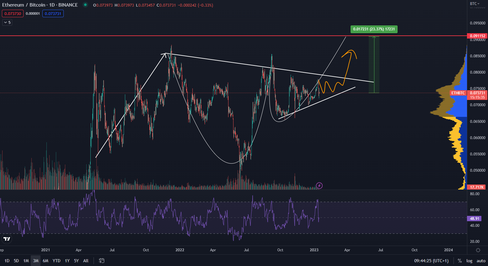 Podľa údajov z TradingView, Ethereum krátkodobo kleslo vo vzťahu k Bitcoinu. Z dlhodobého hľadiska ale skôr osciluje okolo úrovne 0,073 BTC. Počas počiatočnej fázy silného rastúceho trendu sa zisky realizujú predovšetkým na bitcoinovom trhu a altcoiny dosahujú vyššie zisky až v pokročilej fáze rastu v porovnaní s BTC. Výnimkou nie je ani Ethereum.