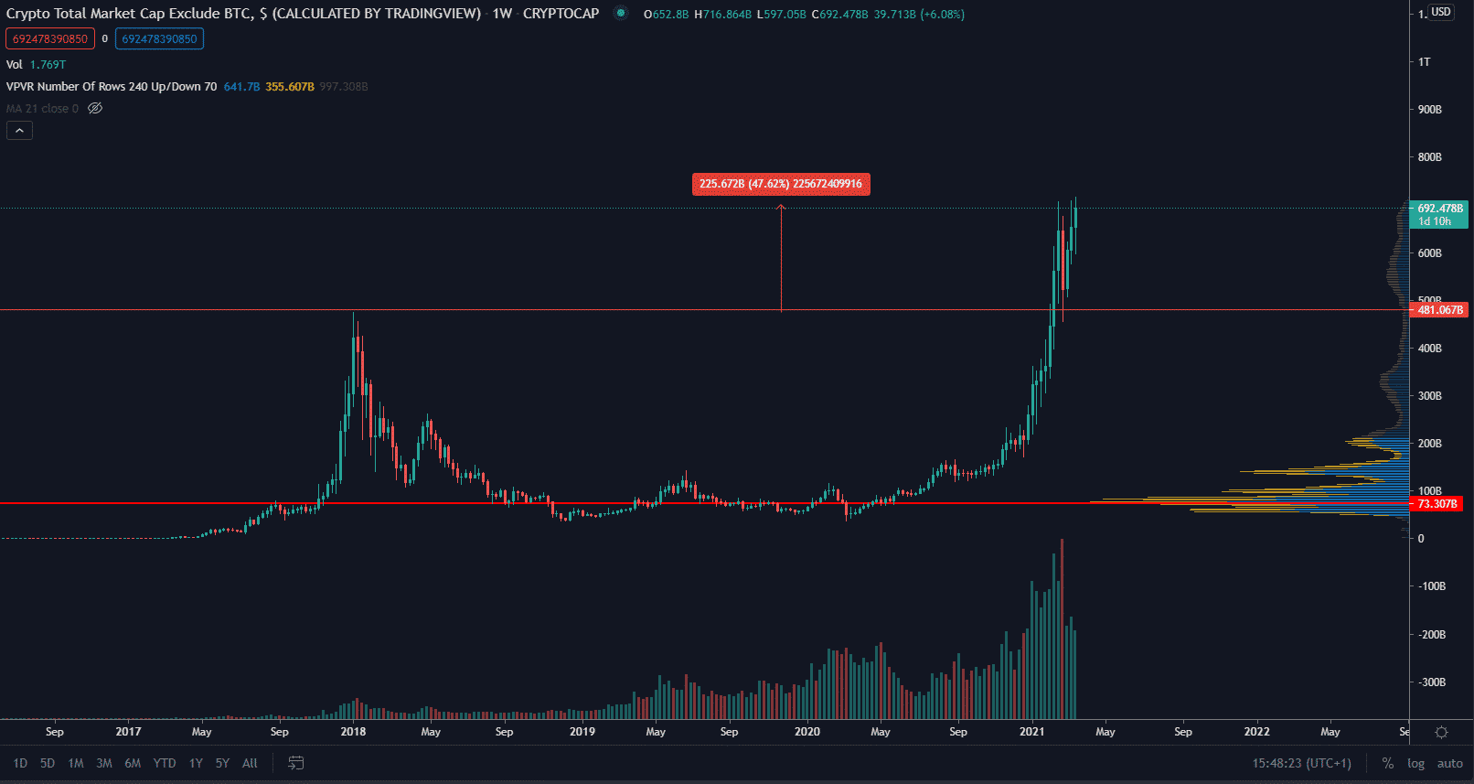 Trh s altcoinmi zaznamenáva výrazný rast takmer celoplošne. Kapitalizácia trhu s altcoinmi dosiahla nové historické maximum takmer 730 miliárd dolárov, čo je zhruba o 50% viac ako v roku 2017.