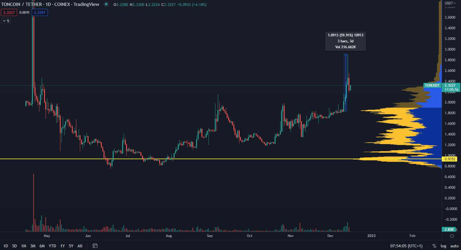 Ako vidíme na grafe nižšie, TON začal prudko stúpať od 11. do 14. decembra, keď vytvoril maximum 2,90 dolára. Medzitým Toncoin vytvoril krátkodobú konsolidáciu a rastúci trend potreboval vychladnúť, keďže v čase písania článku sa obchoduje na úrovni 2,32 dolára. Rovnako si môžeme všimnúť pod grafom aj rast objemov, ktoré boli naposledy zaznamenané koncom októbra.