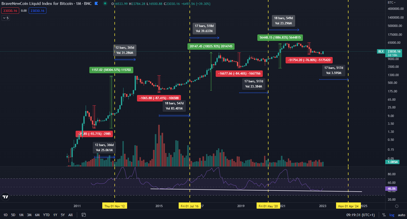 Aktuálne sa začína tvoriť v poradí už v poradí 5. cyklus. Ku rastu pomáha aj blížiaci sa halving, ktorý bude v máji 2024. Počet novovytvorených mincí sa po tejto udalosti zníži o 50 %. Deje sa tak každé 4 roky. Cena bitcoinu sa vždy rok pred halvingom postupne začala spamätávať z poklesov. Aj v tomto prípade všetko nasvedčuje tomu, že do mája 2024 bude bitcoin pokračovať v rastúcom trende. Po halvingu môžeme očakávať stupňovanie dynamiky rastu.