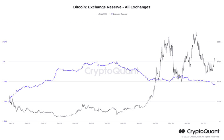 Partnerská analytická platforma CryptoQuant, ktorá sleduje zostatky 21 veľkých búrz, medzitým ukazuje, že celkové zásoby BTC sú teraz najnižšie od 1. augusta 2018, na úrovni 2,303 milióna BTC.