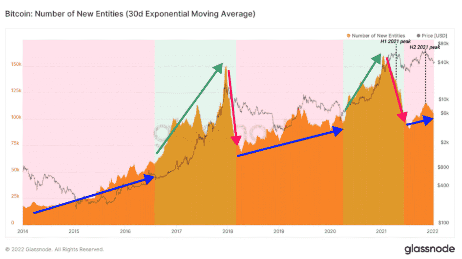 Analytik spoločnosti Glassnode, TXMC, ktorý sledoval nové entity na blockchaine, ukázal, aký tichý bol v skutočnosti Bitcoin z hľadiska maloobchodného prijatia od januára 2021.