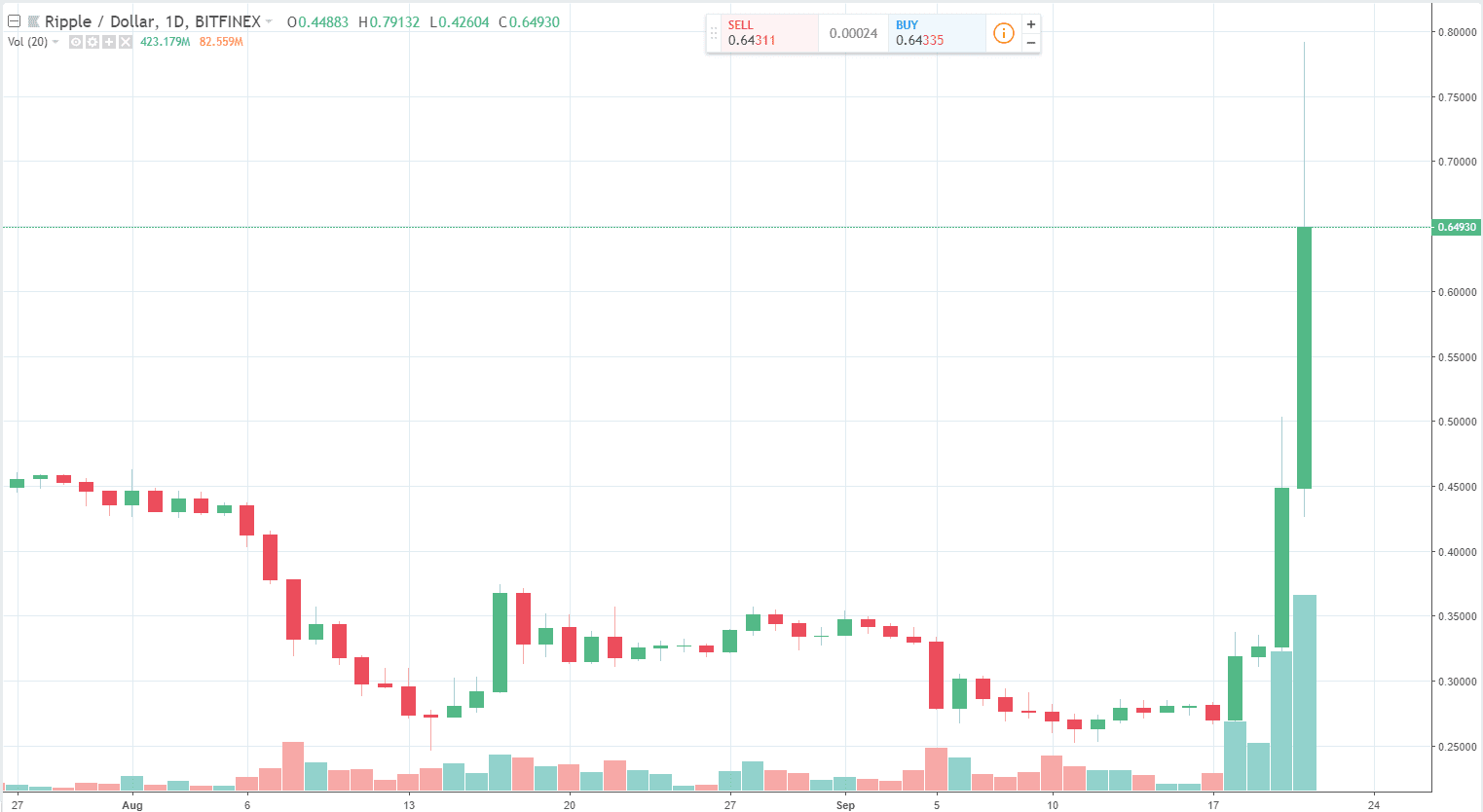 Hype, FOMO, manipulácia alebo zdravý vývoj, nazývať to môžeme akokoľvek. Faktom je, že hodnota XRP tokenu posledných 24-hodín neuveriteľne rýchlo rastie. Písať o presnej cene prakticky nemá zmysel, každú minútu sa totiž mení. Ešte v noci sa na burzách obchodoval za 45 centov a pred necelou hodinou dosiahol nové lokálne high – 79 centov. V čase písania tohto článku sme na 65 centoch.