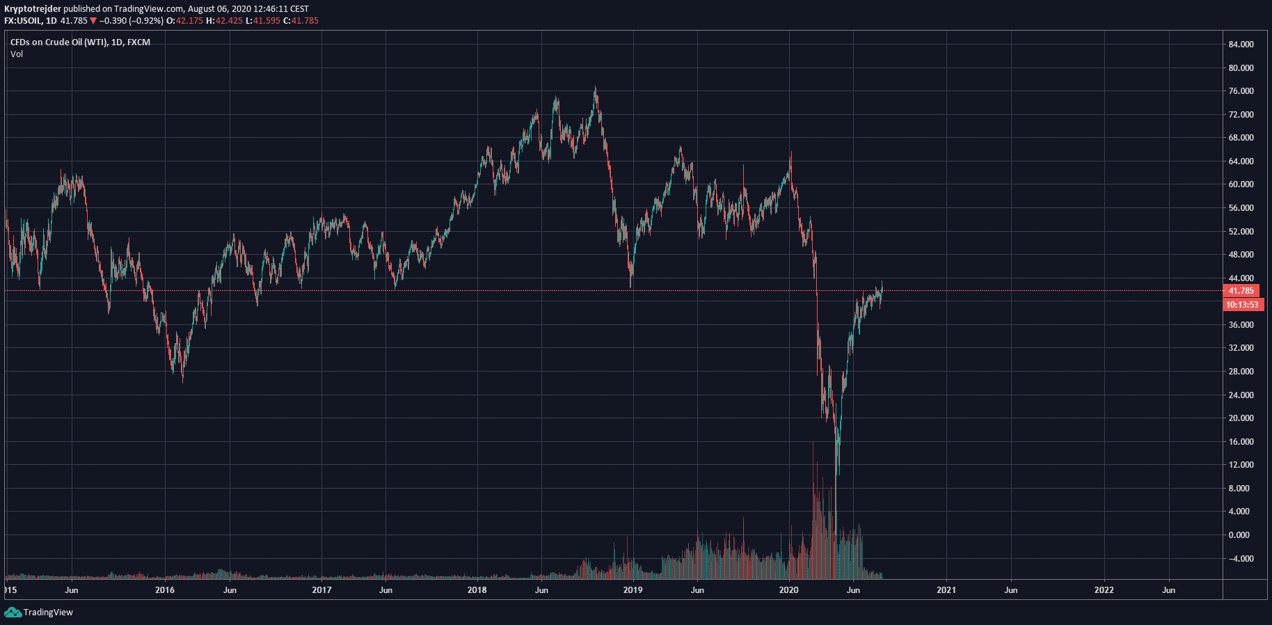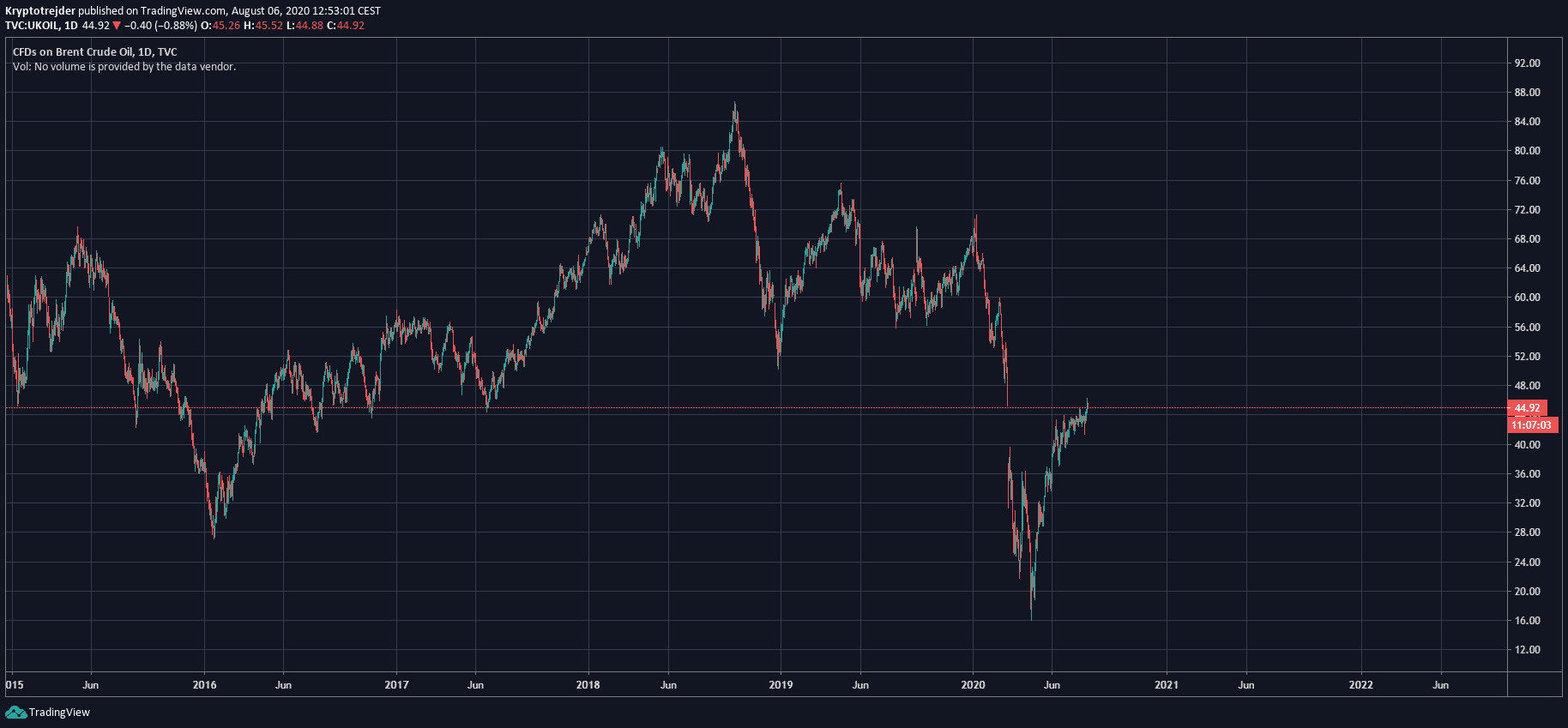 Momentálna cena za barel (159 litrov) americkej ropy WTI so septembrovým kontraktom sa predáva za 41,785 dolárov, aktuálne ku dňu 06.08.2020. Októbrový kontrakt na severomorskú ropnú zmes Brent dosiahol úroveň 44,92 dolárov za barel. Nasledujúce grafy zobrazujú ceny WTI a Brent.