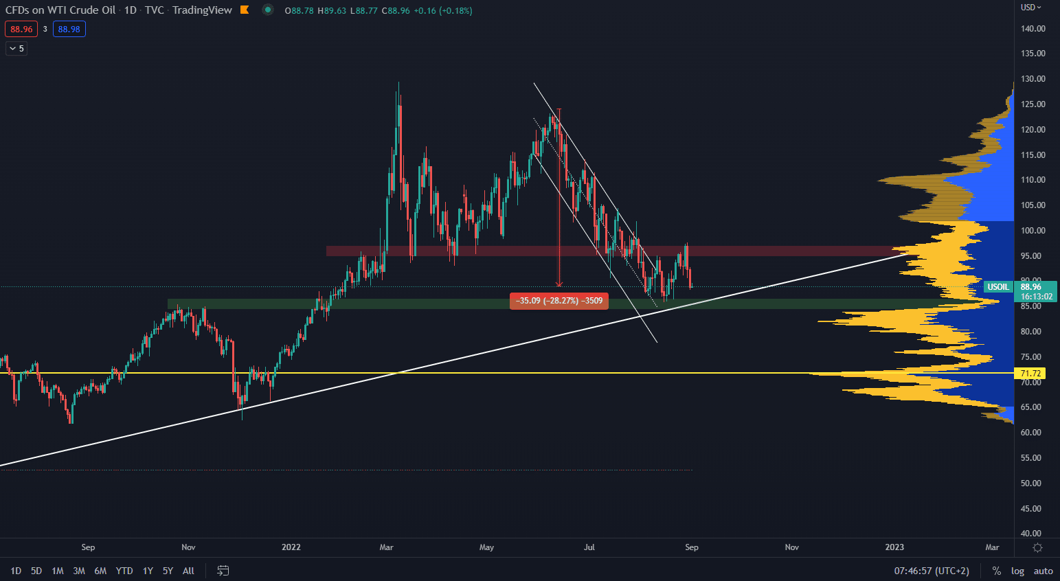 Na grafe nižšie vidíme, že cena WTI ropy klesla na aktuálnych 88,96 dolárov. Ide o pokles zhruba 28 % od vrcholu, ktorý bol dosiahnutý na úrovni 123 dolárov dňa 14. júna. Štruktúra korekcie nebola porušená a celý nedávny rast bol vymazaný okamžitým poklesom.