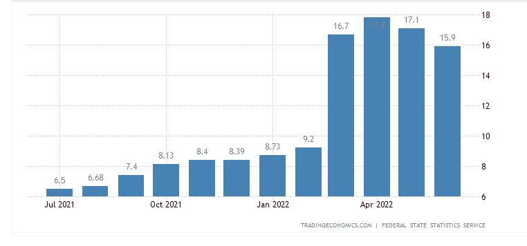 Analytici znížili prognózu rastu inflácie v Rusku. Tá dosiahla podľa posledných čísel hodnotu 15,9 %. Svoje maximum dosiahla v apríli, keď vystúpila na 17,8 %. Odvtedy už tri mesiace po sebe klesá, zatiaľ čo v Amerike a v EÚ každým mesiacom inflácia rastie (pozri tri grafy nižšie). Napriek masívnym a drastickým sankciám, ktoré uvrhol Západ na Rusko pre jeho útok na Ukrajinu a tvrdeniam, že sankcie zaberajú, ruská ekonomika nevykazuje zmeny, ktoré by sa pri takej miere ekonomických sankcií očakávali.