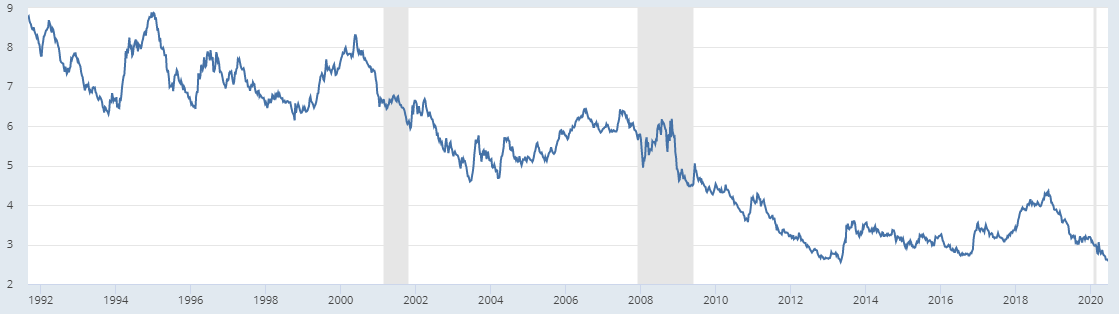 30-ročná hypotéka s pevnou úrokovou sadzbou bola za posledný týždeň 3,13 %, o osem bázických bodov menej ako týždeň predtým. Predchádzajúce rekordné minimum bolo na konci mája na 3,15 %. Pred rokom bola 30-ročná pôžička na bývanie v priemere 3,84 %.