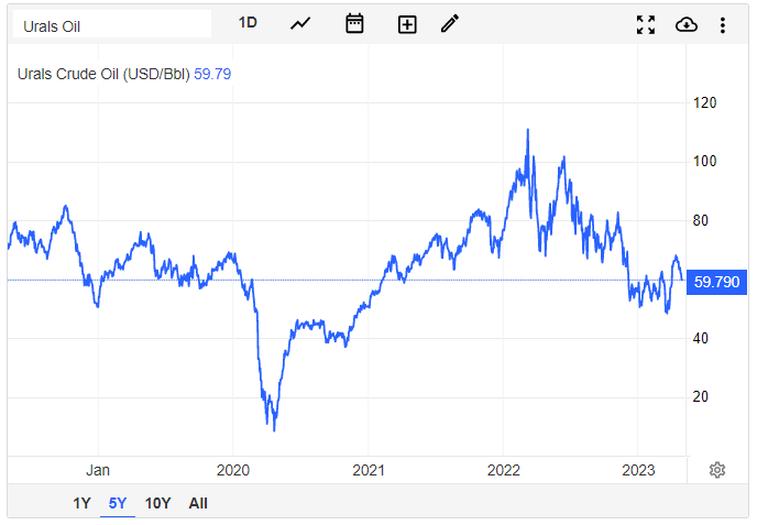 Futures na ropu Ural sa v čase písania článku podľa údajov Tradingeconomics obchodujú na úrovni 59,79 dolárov za barel. Klesli pod cenový strop Európskej Únie, ktorý je 60 dolárov za barel a zároveň sa zužuje zľava na vývoz ropy Ural do iných druhov ropy. Rada federácie schválila od júna zákon obmedzujúci zľavu Ural pri výpočte ciel. Ropa Ural predstavuje referenčnú hodnotu používanú ako cenový štandard pre vývoz ruskej ropy.