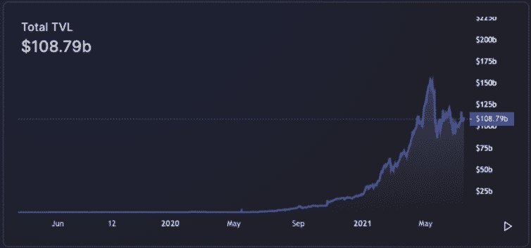 Podľa posledných údajov DeFi Llama celková hodnota, ktorá je uzamknutá v decentralizovaných finančných platformách, klesla zo 154 miliárd USD na aktuálnu hodnotu 108,7 miliárd USD. Dlhodobý horizont však stále ukazuje nárast o neskutočných 5 500%.