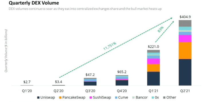 Prvým dôležitým ukazovateľom je metrika objemov obchodov na decentralizovaných burzách. Údaje poskytla spoločnosť Messari, ktorá uviedla, že štvrťročný objem DEX dosiahol na konci 2. štvrťroku 2021 hodnotu takmer 405 miliárd USD. Je to najvyššie historická hodnota. Keď si tieto údaje porovnáme napríklad s 2. štvrťrokom 2020, je to nárast neuveriteľných o 11 751% .