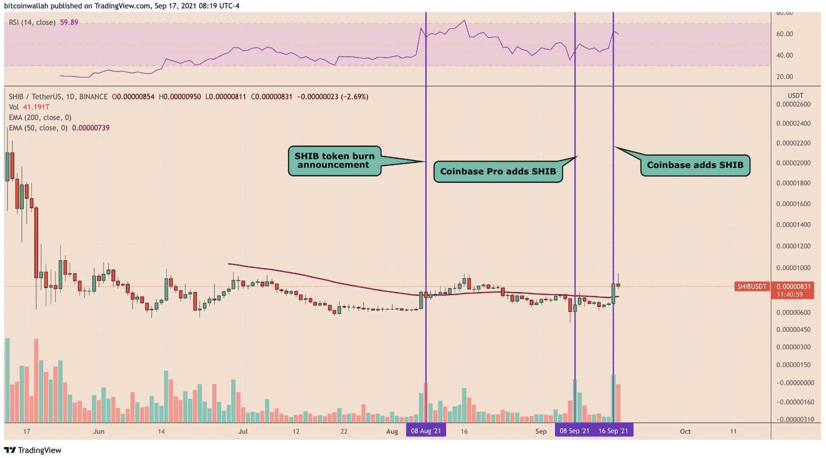 Rast tokenu SHIB mal navyše ešte jeden katalyzátor. Sadzby SHIB/USD už smerovali vyššie po pridaní tokenu na americkú platformu Coinbase Pro so sídlom v USA začiatkom tohto mesiaca. Coinbase taktiež oznámil, že na svoju platformu pridá podporu SHIB.