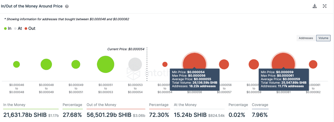 Na základe populárneho modelu „In/Out of the Money Around Price” portálu IntoTheBlock sa v minulosti pri cenovej úrovni 0,000055 USD nakúpilo viac ako 18 000 tokenov SHIB. A práve majitelia týchto tokenov by mohli zasiahnuť a prelomiť úroveň odporu. Aj keď by to zrejme spomalilo rastový trend, z dlhodobého hľadiska to môže spôsobiť výrazný nákupný tlak.