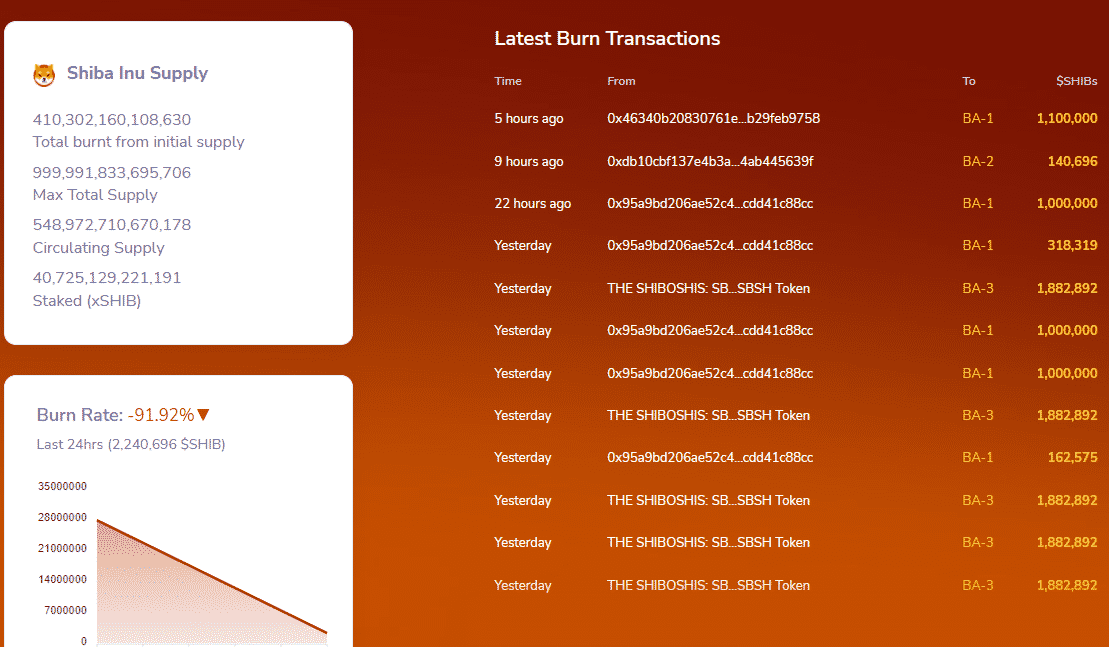 Spaľovací proces prebehol 7. až 9. februára, pričom spálených bolo postupne 56, 37 a 46,7 milióna tokenov SHIB. Za posledných 24 hodín bolo v celkovo piatich transakciách presunutých z obehu ďalších 4 441 908 SHIB. K dnešnému dňu je teda celkové spálené množstvo tokenov na hodnote úctyhodných 410 biliónov mincí.
