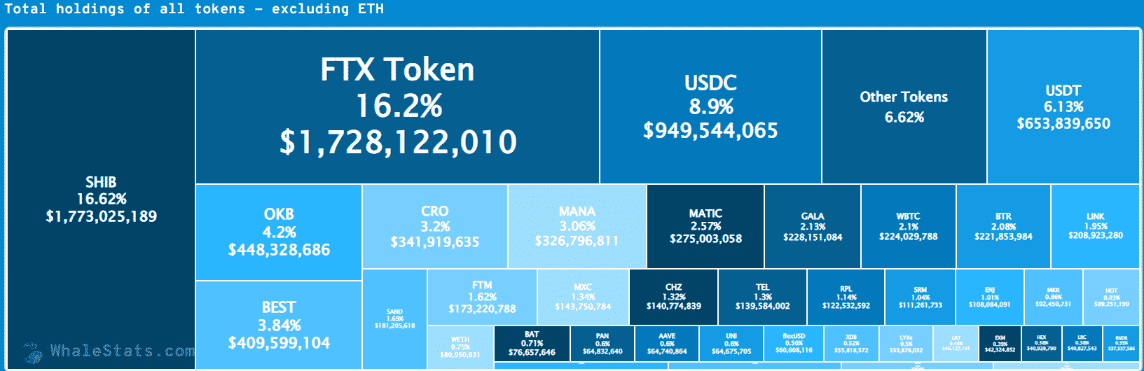 Percentuálny podiel tokenu SHIB v peňaženkách veľrýb je 16,62 %, čo predstavuje hodnotu 1 773 025 189 USD. Za ním nasleduje token burzy FTX – FTT so 16,2 %.