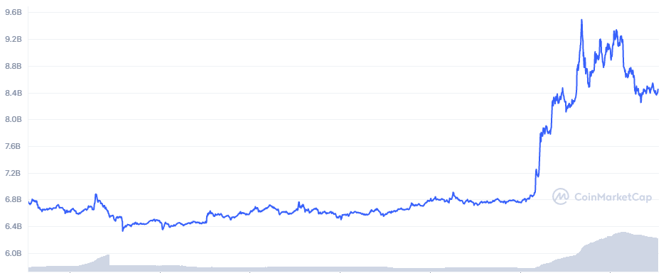 V čase písania tohto článku bola trhová kapitalizácie tohto psieho projektu na úrovni 8,392 miliardy dolárov. Za posledných 7 dní ide o nárast až o 22,29 %.