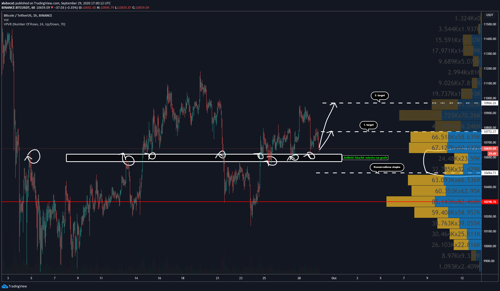 BTC nám opäť začal počas dnešného dňa padať. Avšak to je príležitosť pre nás. Na hodnote 10 600 USD narazil na silný support, kde podľa očakávanej pravdepodobnosti môžeme lokalizovať pomerne čistý signál na long. Tým, že som tento signál nazval pomerne čistým však neznamená, že sa musí obchod vždy podariť, preto bez stoplossu aktuálny set-up určite neodporúčam obchodovať.