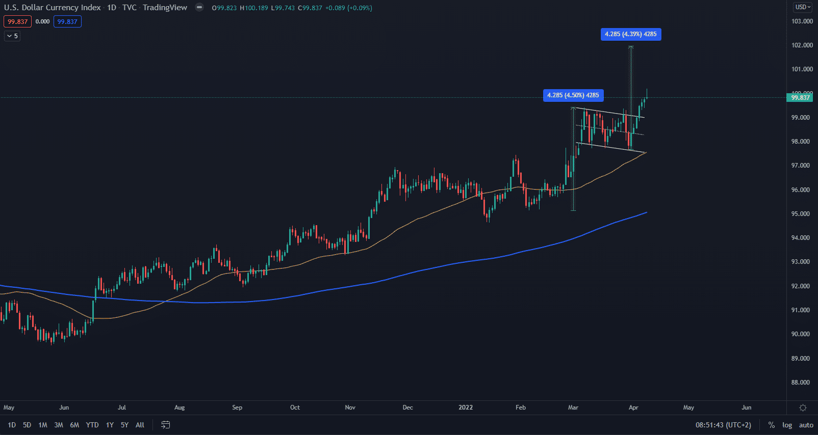 Index amerického dolára (DXY), ktorý meria silu dolára voči zahraničným menám, dosiahol 9. apríla svoje 21-mesačné obchodné maximum 100,189, čo je najvyššia úroveň od mája 2020.