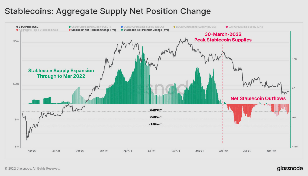 Z trhu stablecoinov odchádza vysoký objem kapitálu, konkrétne od 4 do 8 miliárd dolárov mesačne. To odráža približne 8 % z celkovej ponuky stablecoinov a naznačuje to, že väčšina kapitálu stále zostáva v týchto minciach. Na grafe nižšie môžeme vidieť, že od marca 2022 trh čelí vysokému čistému odlivu stablecoinov.