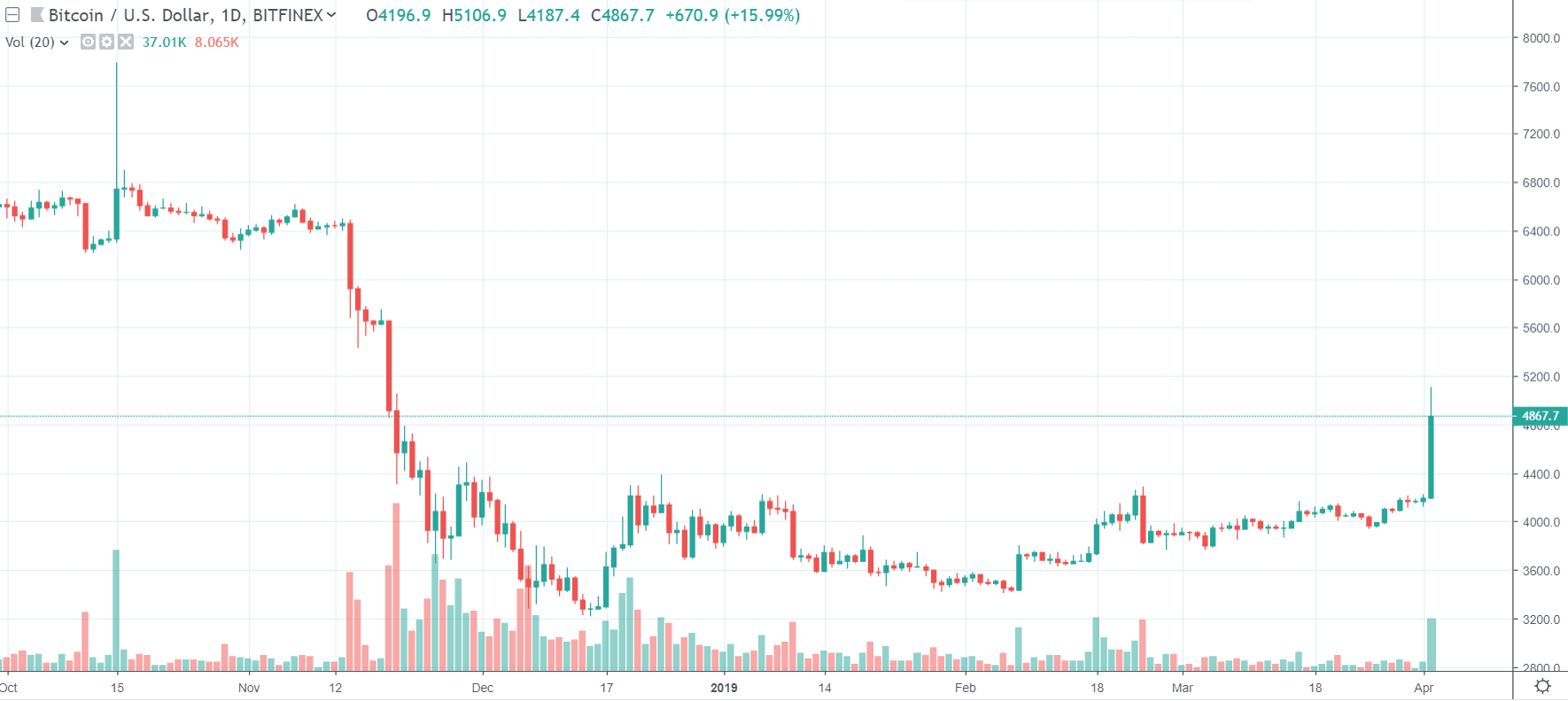 Včera bola situácia o niečo horšia. Na tradičných trhoch sa zobchodovalo slabých 230 miliónov, čo je hlboký podpriemer. Dnešný skok môžeme pripísať pumpe na trhu s kryptomenami. Bitcoin dnes ráno povyskočil z 4200 $, prekonal kľúčovú rezistenciu a otestoval hladinu 5000 $. Test tejto ceny však nedopadol dobre a momentálne sa obchoduje ľahko pod 4800 $ (USD trhy) a ľahko pod 4900 $ (USDT trhy).