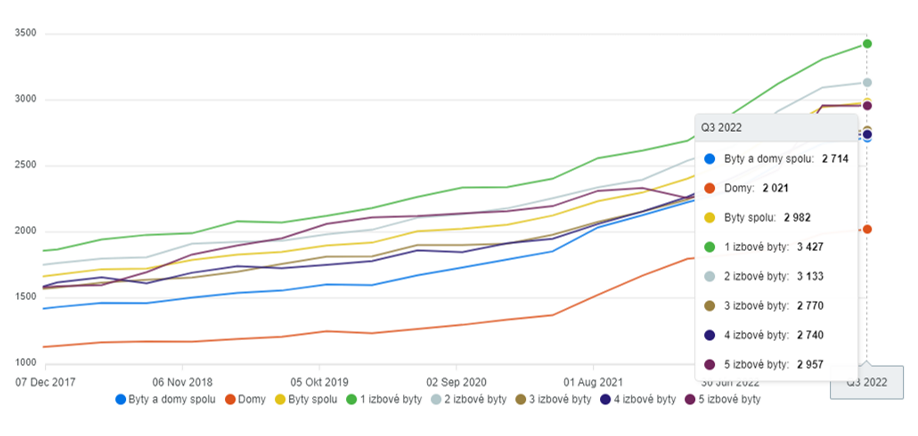 Podľa portálu nehnuteľnosti.sk pokles priemernej ceny 2-izbových bytov za posledný kvartál 2022 predstavoval 0 až 7 %. Z tohto údaju môžeme predpovedať, že pokles cien nehnuteľností zatiaľ nie je taký intenzívny ako si mnohí myslia.