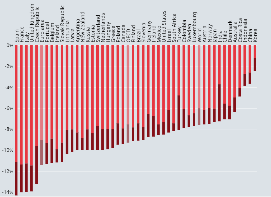 Organizácia pre hospodársku spoluprácu a rozvoj (OECD) odhaduje, že z okolitých krajín bude na tom horšie iba Česko. Hrubý domáci produkt v tomto roku poklesne o 9,3 % a aj to len v prípade, že nenastane druhá vlna vírusu. Na porovnanie sa pozrieme aj na prepady HDP okolitých krajín: