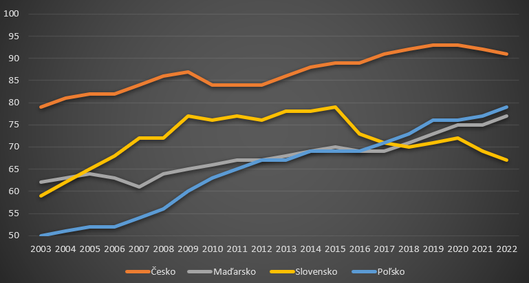 Pre porovnanie, životná úroveň stúpla v Česku na 91 %, Poľsku 79 % a Maďarsku 77 %. Graf nižšie zobrazuje ako Slovensko v posledných rokoch začalo zaostávať. Podľa tejto metriky je za nami iba Bulharsko s hodnotou 59 %. Čo je ale hlavným dôvodom tohto nepomeru?