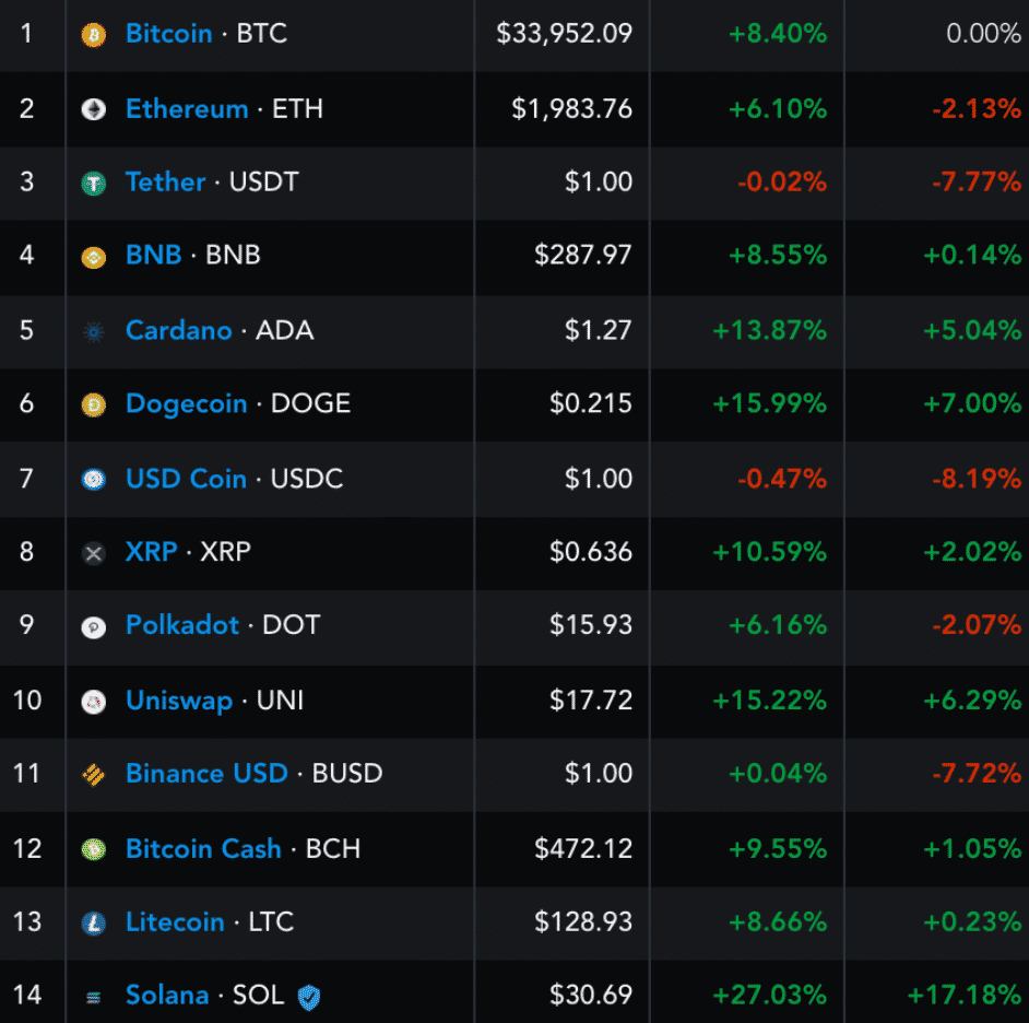 Solana sa začiatkom tohto týždňa prepadla o viac ako 42% po zverejnení správ čínskej vlády o nových zákazoch smerovaných proti kryptomenám. Väčšina kryptomien sa však odrazila od lokálneho dna. V prípade BTC to bol nárast o 19,44% z úrovne 28 800 USD na 34 400 USD. Ethereum sa dokázalo odraziť až o 20,29% na cenu 2045 USD. Víťazom sa však prekvapujúco stal projekt Solana, ktorému sa podaril najvýraznejší odraz zo všetkých kryptomien.