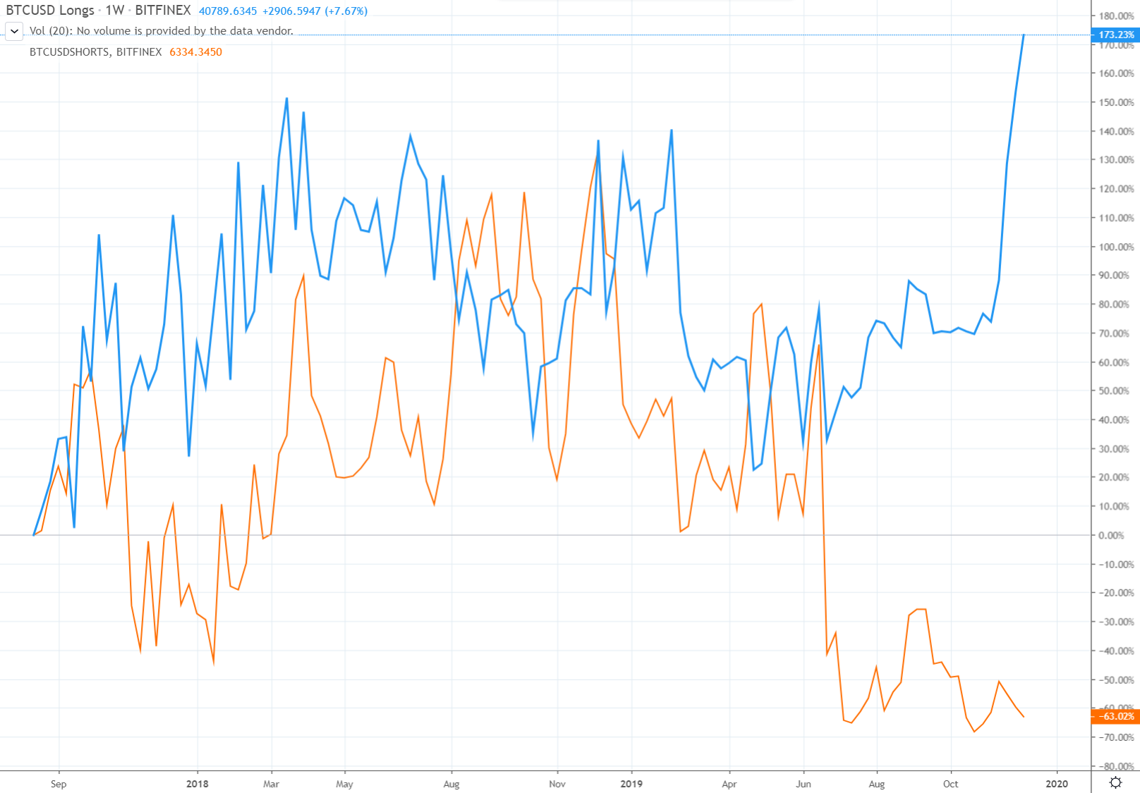 O tom, že bitcoin by mal ísť hore, svedčí aj pomer short a long pozícií na Bitfinexe. Zatiaľ čo shorty sú na minime, longy už dlho neboli vyššie. Tlak býkov na cenu je teda obrovský. Na druhej strane, Bitcoin často pred veľkým rastom ešte na chvíľu dumpne, aby zlikvidoval čo najviac long pozícií.