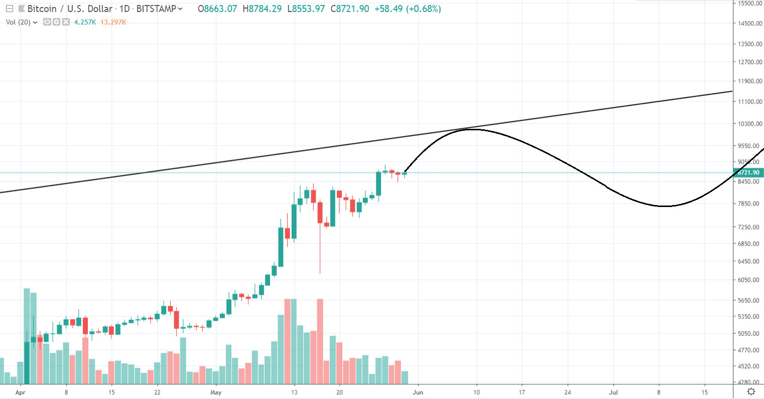 Tá sa aktuálne nachádza na úrovni 10 000 $, čo je cena, ktorú Bitcoin s veľkou pravdepodobnosťou aspoň na chvíľu dosiahne. Ak by sa od nej odrazil a nastala by korekcia, ďalšia šanca na pokorenie trendline sa už nemusí opakovať.