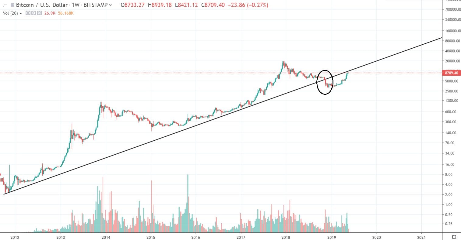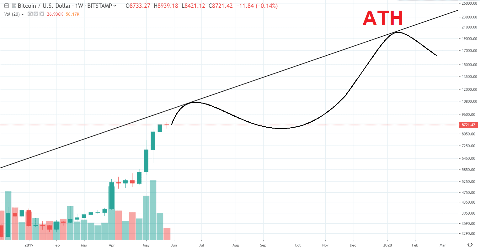Ani rast na nové ATH v priebehu roka 2019 (ako som to predikoval) nemusí pomôcť. Trendline sa bude v decembri 2019 pohybovať okolo ceny 19 000 – 20 000 dolárov.