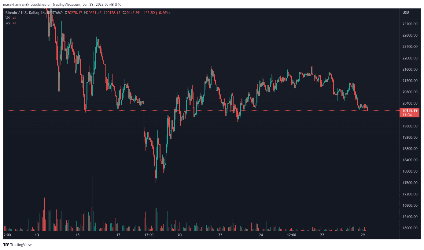 V čase písania tohto článku sa BTC obchoduje na úrovni 20 145 USD. Za posledných 24 hodín klesol o takmer 3 %.