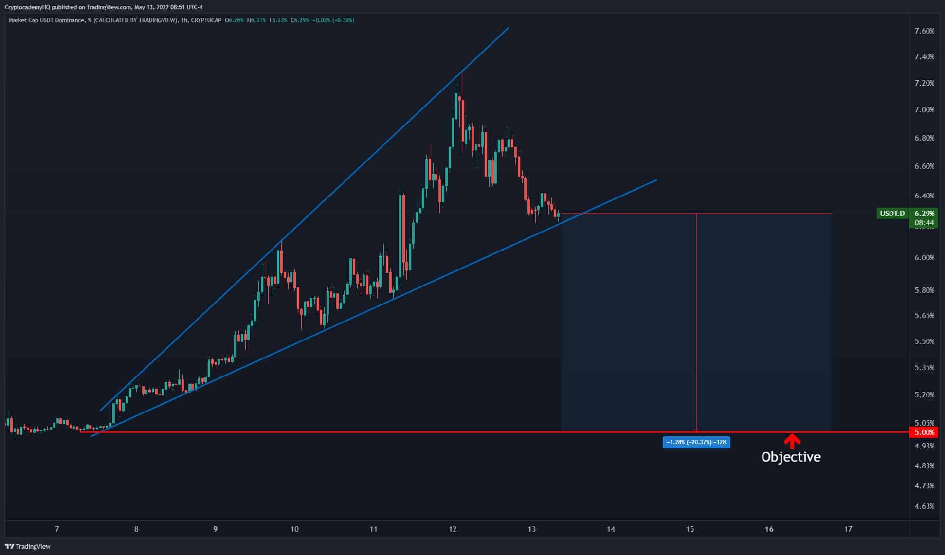 Bennett sa dosť aktívne zaoberá aj grafom dominancie USDT.D. Ide o index, ktorý sleduje ocenenie stablecoinu USDT v pomere k trhovej hodnote všetkých kryptomien. V prípade rastového trendu tohto grafu, sa investori orientujú na predaj kryptomien, aby tak vložili svoj kapitál do Tetheru. V opačnom prípade investori nakupujú BTC a altcoiny.