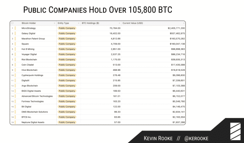 V roku 2019 mali verejné spoločnosti vo svojich držbách iba 20,000 BTC. Tento údaj sa zvýšil na 105,837 BTC za 12 mesiacov.