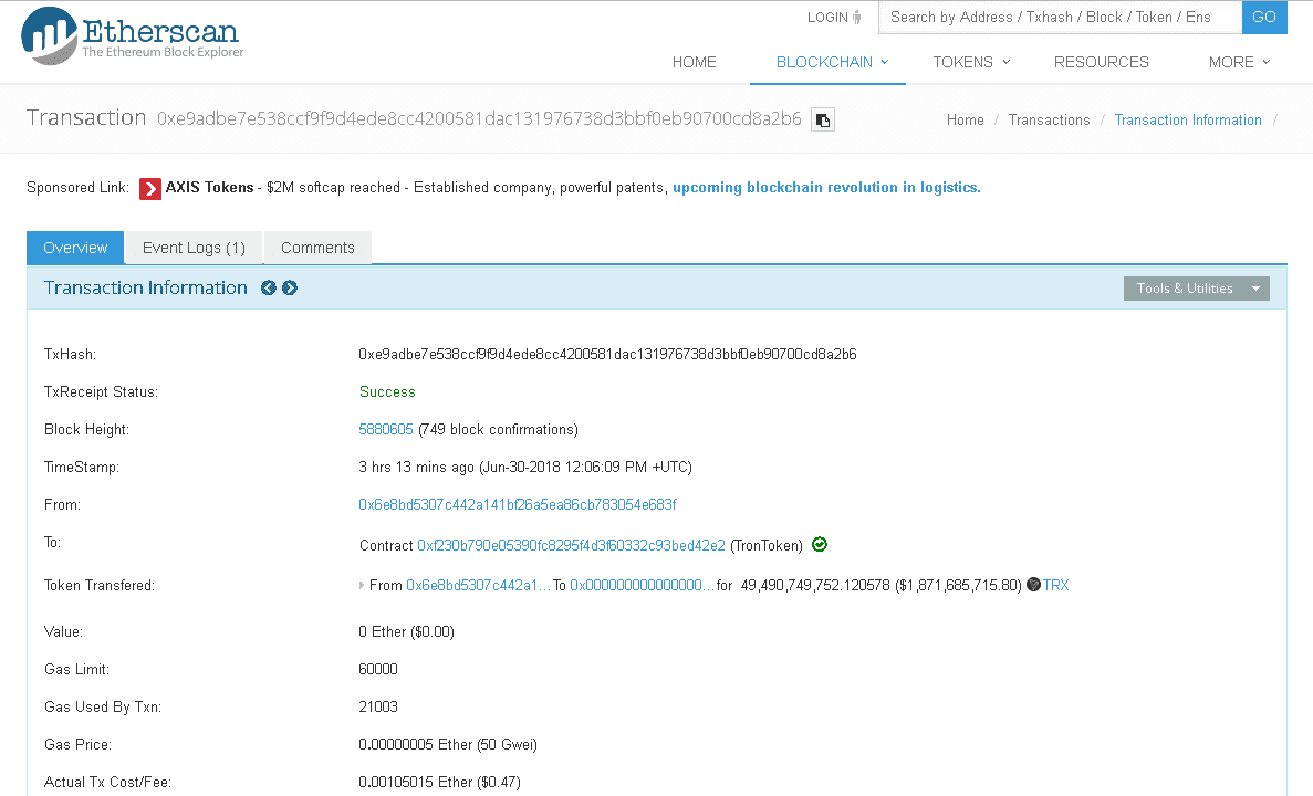 Pri spustení mainnet swapu 25. júna začala spoločnosť Tron migrovať svoje tokeny zo siete Ethereum do svojho mainnetu. Zároveň začal proces zničenia starých Tron tokenov ERC20, známy aj ako „burning”. V prvom kole ich bolo zničených takmer dve miliardy. Teraz spoločnosť Tron uverejnila snímku obrazovky s protokolom Etherscan, zobrazujúcu 49 491 130 776,584279 TRX, ktoré boli odoslané na adresu Ethereum: 0x0000000000000000000000000000000000000000. Viac sa dočítate TU: https://cryptoslate.com/ (v EN)