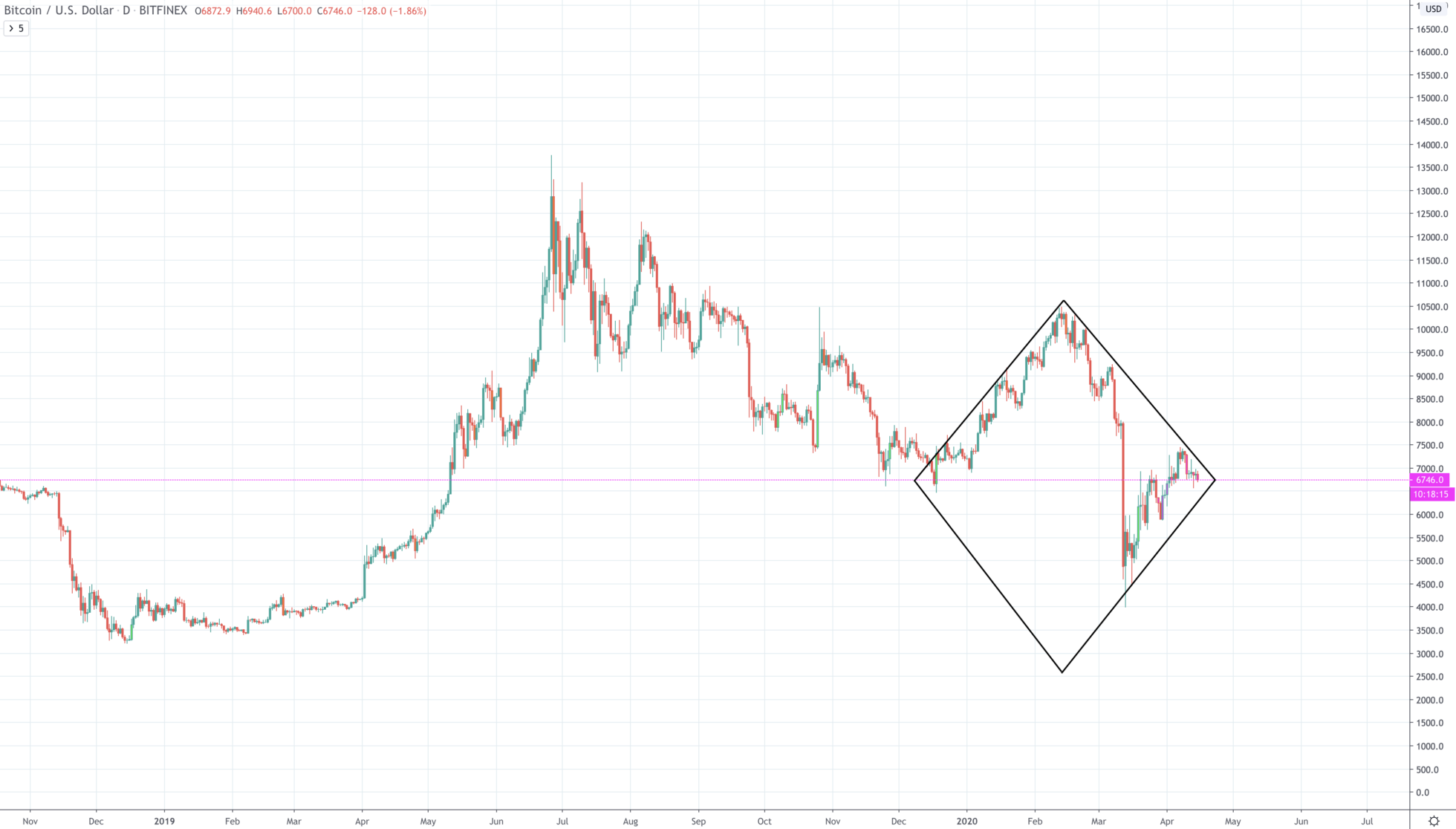 O čo ide? Nuž, Diamond je formácia, ktorá má 50% šancu, že daný asset pošle smerom hore. Samozrejme, je tu tiež 50% šanca na dump, no Bitcoin s najväčšou pravdepodobnosťou neostane na aktuálnej hladine.