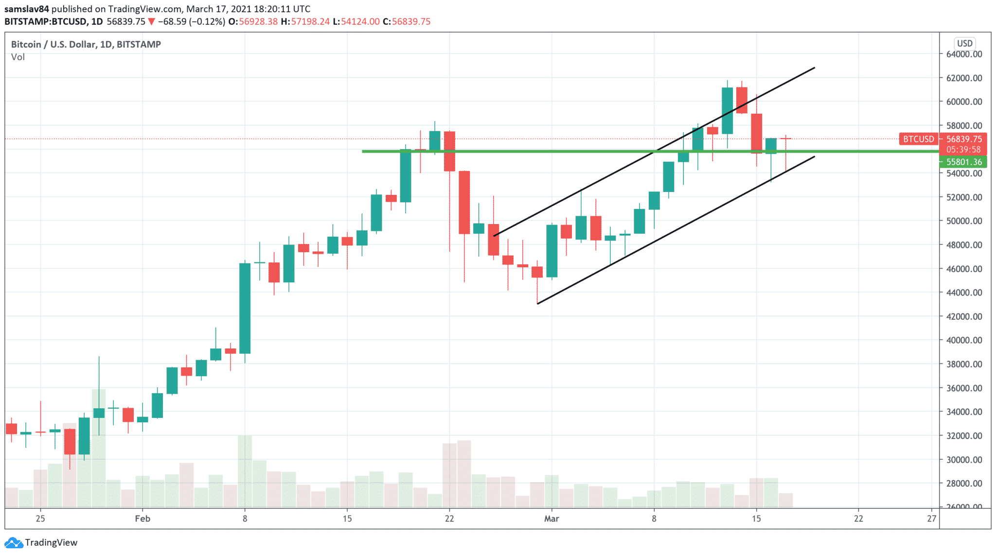 Bitcoin sa naďalej oklepáva z korekcie, ktorá začala v poslednom februárovom týždni. Zvládol už síce vytvoriť historické maximum a dokonca prekonal aj hladinu 60 000 dolárov, no v pondelok 15.3. klesol späť a situácia na trhu je aktuálne mierne nepokojná.