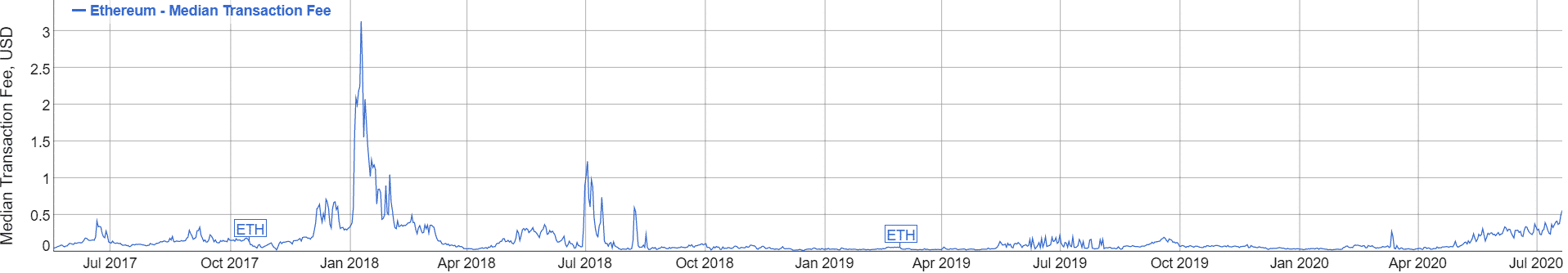 DeFi boom vytvára obrovský tlak na Ethereum blockchain. Sieť nezvláda spracovávať množstvo transakcií a vo výsledku tak poplatky vyleteli na dvojročné maximum. Podľa stránky bitinfocharts.com momentálne za poslanie Etherea zaplatíte 0,56 $ (medián). Naposledy sa poplatky tak vysoko vyšplhali v lete 2018.