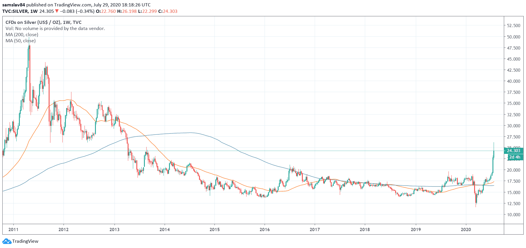 Hodnota striebra od roku 2011 – weekly graf