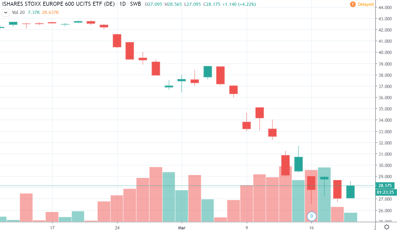 Aj Európske indexy mierne posilnili, no stále sú pod včerajšou open cenou. Paneurópsky Stoxx Europe 600 však dnes narozdiel od DJI iba rástol. Dôvodom je pravdepodobne reakcia ECB na súčasnú situáciu a predstavenie balíčka protiopatrení v hodnote 750 miliárd eur. Tieto peniaze v najbližšej dobe napumpuje do ekonomiky, čo by ju mohlo oživiť. Je však otázne, či tlačenie nových peňazí oddiali krízu.