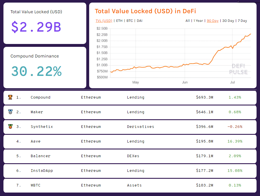 Compound v polovici júna prekvapil masívnym rastom o 300% a predbehol tak dlhoročného kráľa Maker. Aktuálne oba projekty bojujú o prvú priečku v kapitalizácii. Compound dosahuje 700 miliónov dolárov, Marek aktuálne prekonáva 650 miliónov. Tretí synthetix sa chystá pokoriť 400 miliónov. Stomiliónovú magickú hranicu prekonávajú ešte ďalšie štyri projekty – Aave, Balancer, InstaDApp a WBTC. Všetky tieto projekty fungujú na Ethereu.