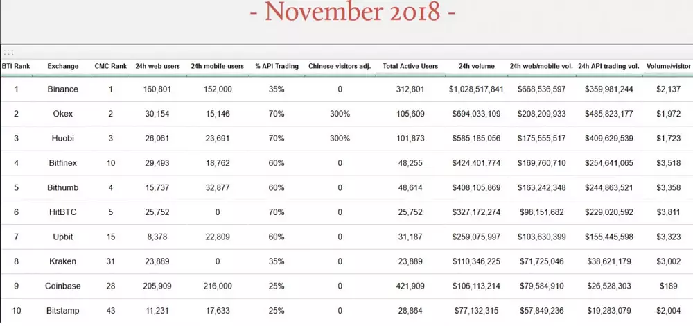 Blockchain Transparency Institute vydal rebríček kryptobúrz, v ktorom sa zameriaval na objem zrealizovaných obchodov, množstvo klientov aktívnych za posledných 24 hodín, ako aj ich celkový počet. Vo viacerých aspektoch zvíťazila kryptoburza Binance. Najmarkantnejší náskok pred druhou burzou v poradí, OKEx, získala v počte denných web klientov – 160 000 verzus 30 000 v prospech Binance.