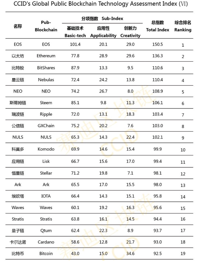 Čínska vládna organizácia China Electronic Development Industry (CCID) zverejnila v poradí už svoje šieste ratingové hodnotenie kryptomien. Tak ako aj v predošlých prípadoch, znovu skúmala ich prínos v oblasti technológie, využiteľnosti a inovácie. Na prvom mieste sa opäť udržal EOS, nasledovaný projektmi Ethereum a BitShares. Prvé dve priečky tvorcovia rebríčka komentovali slovami: