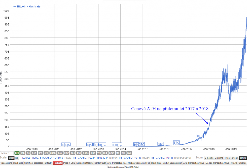 Hashrate je miera výpočtovej sily vynaložená na prevádzku BTC siete. V podstate to ukazuje, koľko počítačov (Asicov) sa podieľa na prevádzke siete. Tá je momentálne 6x vyššia než bola pri najvyšších cenách na konci roka 2017.