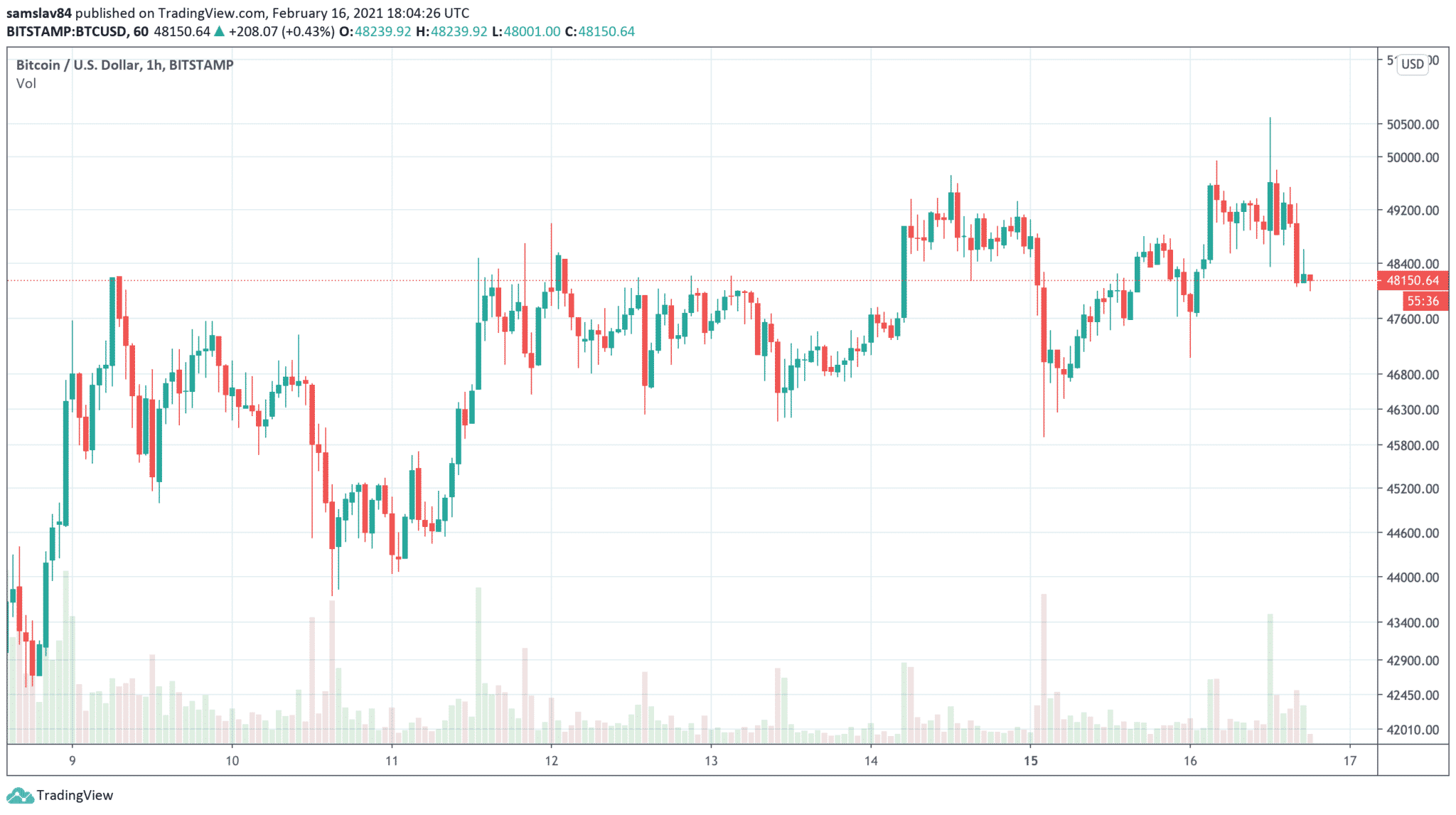Február 2021 je zatiaľ pre Bitcoin veľmi priaznivý. Najväčšia kryptomena sa odrazila od supportu na cene 30 000 $ a aj vďaka Elonovi Muskovi a jeho Tesle už klope na päťdesiattisícovú rezistenciu. Okrúhla 50-tisícka zatiaľ drží a dva útoky na túto hladinu skončili neúspechom. Traderi si očividne nie sú istí ďalším rastom a pri tejto magickej hladine majú nastavené predajné objednávky.