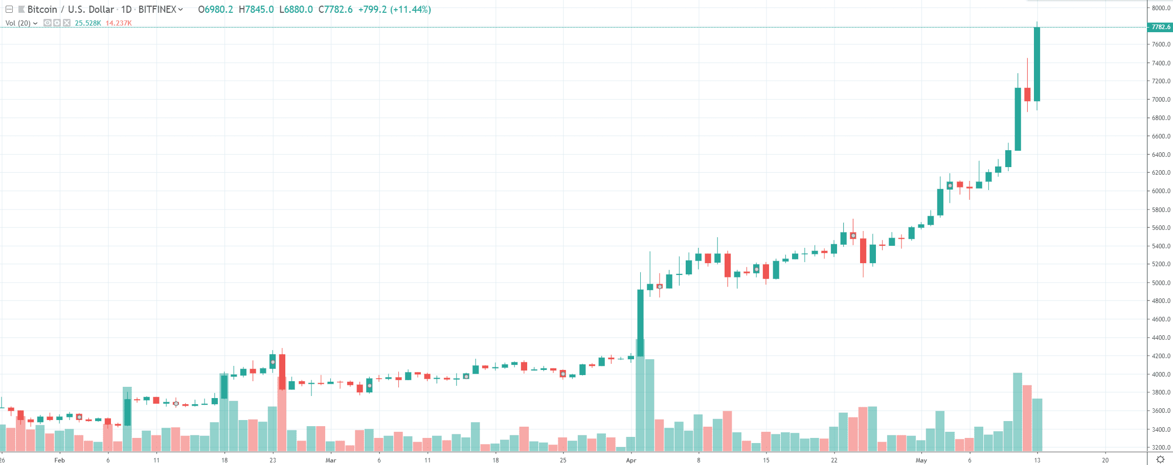 Bitcoin pokračuje vo svojom bull-rallye a dnes zaznamenal rast o ďalších 12 %. Zatiaľ čo ráno sa obchodoval za necelých 7 000 $, momentálne už útočí na 8 000 $! Neuveriteľný skok. Aktuálna situácia je o to bizarnejšia, že Bitcoinové rallye trvá už viac než tri mesiace a stále nevykazuje známky spomalenia.