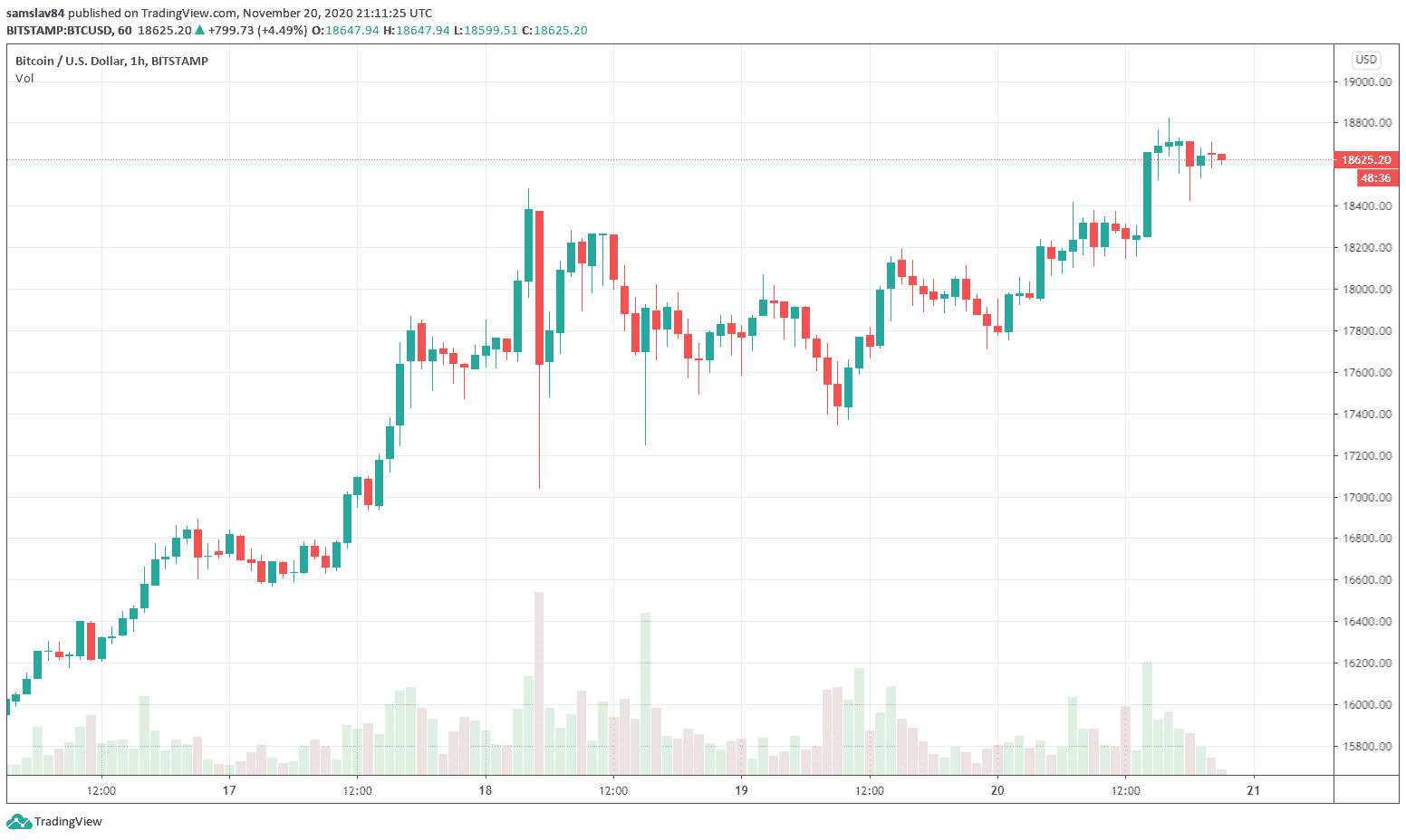 18 834 $ – toto je nové tohtoročné cenové maximum Bitcoinu. Táto kryptomena dnes opäť rastie a po včerajšej korekcii na 17 400 $ je opäť hore! Volatilita na trhu dosahuje rekordne úrovne. Pohyby o viac než 100 $ sú prakticky na dennom poriadku a okrem Bitcoinu dnes raketovo rastú aj altcoiny.